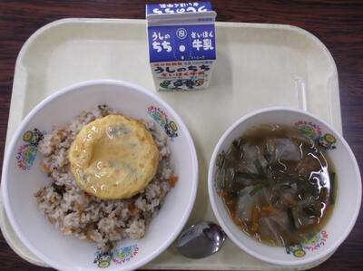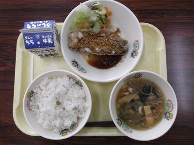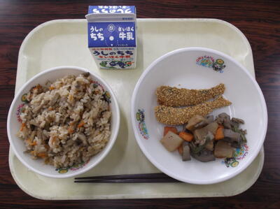 ○ご飯 ○焼き魚 ○ひじきのいため ○お月見汁 ○牛乳