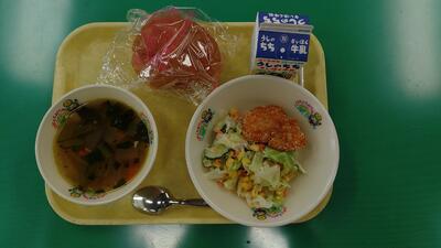 ○そぼろ丼 ○米粉のワンタンスープ ○ブルーベリーゼリー ○牛乳