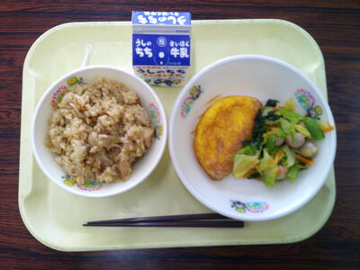 〇ターメリックライスクリームソースがけ 〇ビーンズサラダ 〇牛乳