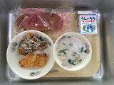○ご飯 ○ひじきの炒め煮 ○さばの味噌だれ ○けんちん汁