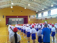 赤・青・黄ブロックの各ブロックが集まり、運動会に向けて連帯感を高めました。応援団の自己紹介やかけ声の練習をしました。