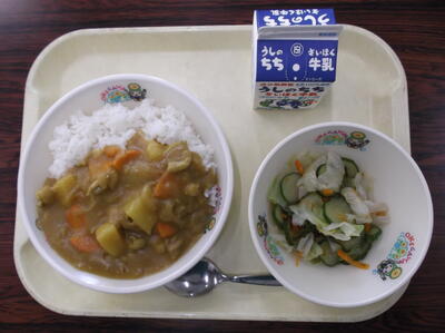 ○チキンカレーライス(豆乳) ○たまねぎドレッシングサラダ ○牛乳
