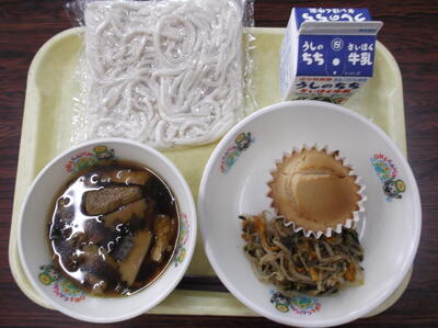 ○わかめうどん ○きなこカップケーキ ○もやしのおかか炒め