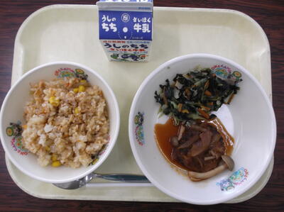 ○ツナピラフ ○つくねバーグ ○ほうれん草のソテー ○牛乳