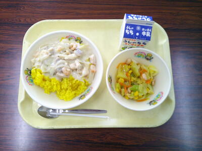 〇ターメリックライスクリームソースがけ 〇ビーンズサラダ 〇牛乳