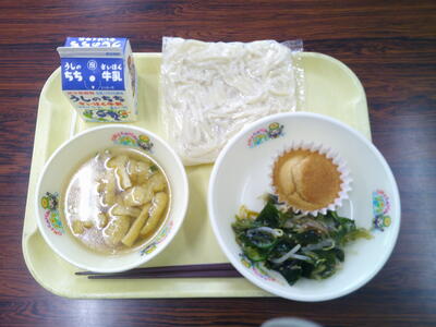 ○白だし関西風うどん ○キャラメルマフィン ○海藻サラダ ○牛乳