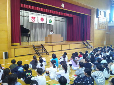 全校集会・音楽集会(5月) 投稿: 管理者 (14:45) 5月の全校集会・音楽集会がありました。 校長先生の話では、 〇1カ月がたち、心が疲れている時期です。困ったことや悩んでいることがあった場合は、スマイル相談員に相談してみましょう。 という話から、スマイル相談員の紹介がありました。 音楽集会は「校歌」を歌いました。初めは456年、次に123年と歌い、最後には全校で歌うことで「歌声ひびく桶川小」になりました。 -