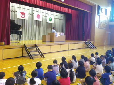 今月の音楽集会は「スマイルアゲイン」です。低学年と高学年がパートに分かれて体育館いっぱいに歌声が響きわたりました。