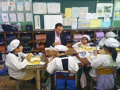 小野桶川市長も来校し、4年生の児童と給食を交流しました。