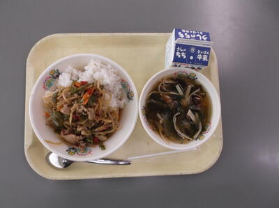 ○チンジャオロース丼 ○わかめスープ ○牛乳
